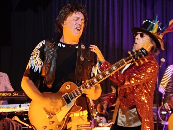 Lokalmatador Calo Rapallo mit Friends heizten in der Alten Kelter mächtig ein. Mit Musik von Jimi Hendrix, Eric Clapton, J. Page, Jeff Beck wurde durch verschiedene Stilrichtungen – von Rock, Funk, Soul, über Heavy Metall, Blues bis zum Politfolk – gestreift. Die Liebe der Musiker jedoch, gehört dem Blues. Die Musik ging durch und durch. Heiße Rhythmen und fetzige Solis verzückten das Publikum. Begleitet wurde Rapallo von Frank Mühlberger am Bass, Thomas Kelsch an den Drums und Jean Pierre Barrache an den Keyboards. Grandios!