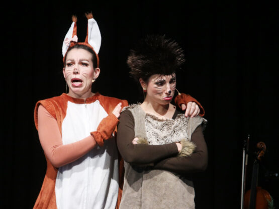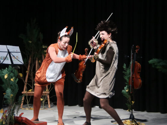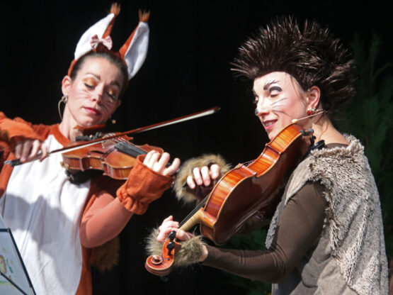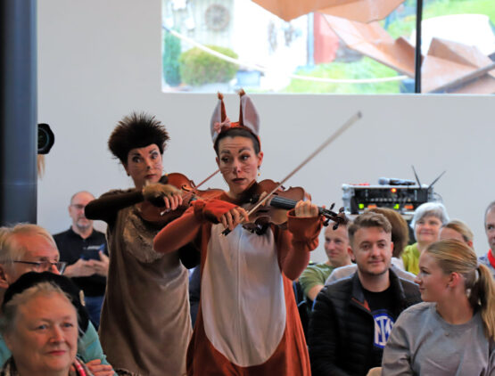 Ein virtuoses Wald-Kinderkonzert der Twiolins verwandelte die Alten Kelter in einen klingenden Märchenwald. Marie Luise (als Eichhörnchen) und Marta (als die Igelin), erzählten gemeinsam – musikalisch und spielerisch – die Geschichte davon, wie die beiden Waldtiere ihr eigenes Konzert auf die Beine